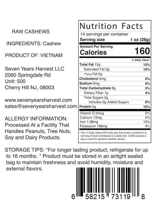 Seven Years Harvest Raw Unsalted Cashews 16 Oz (454 gr)